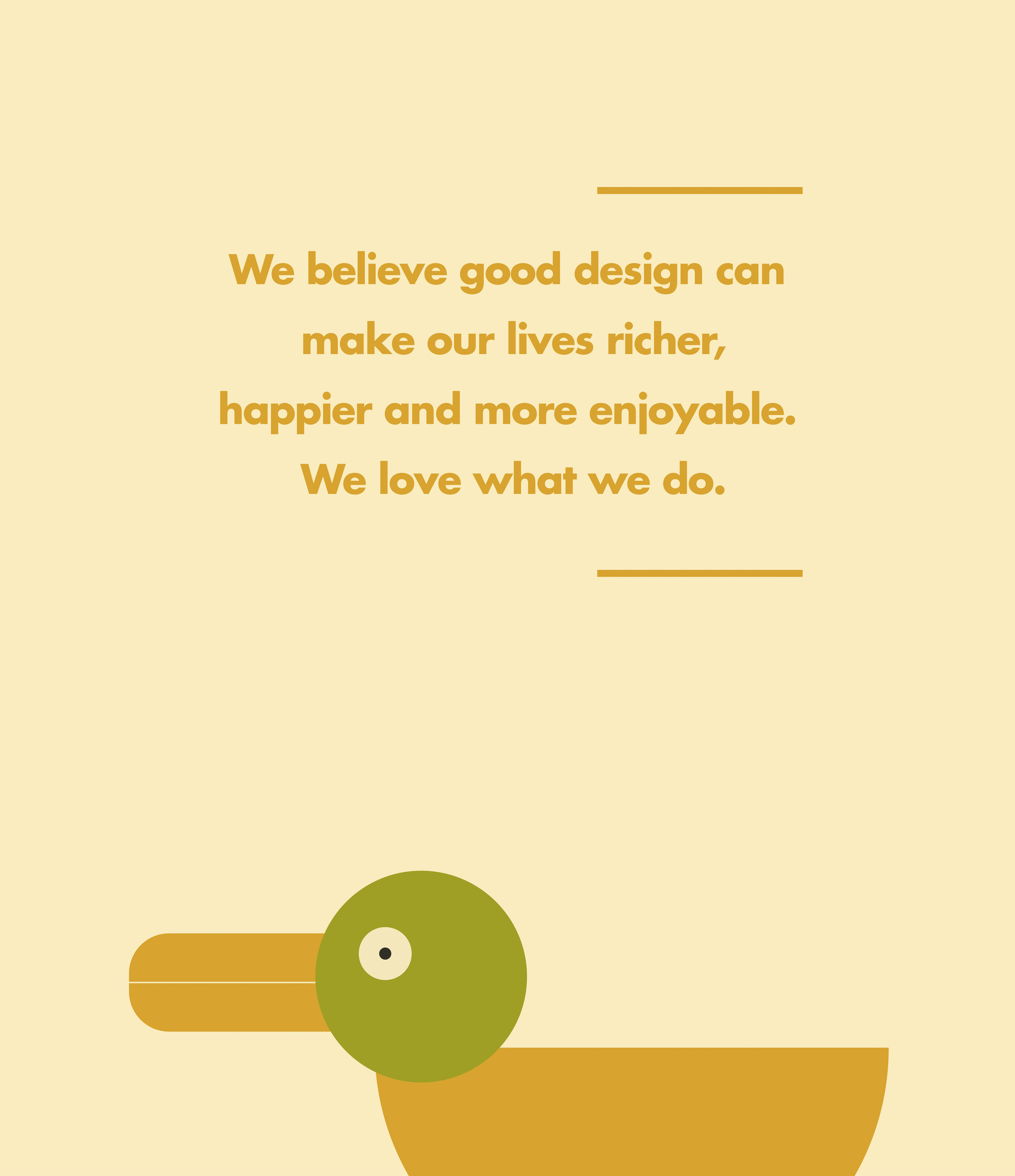 We believe good design can make our lives richer, happier and more enjoyable. We love the design process, sharing humourous and creative ideas, building a strong relationship with you based on trust.