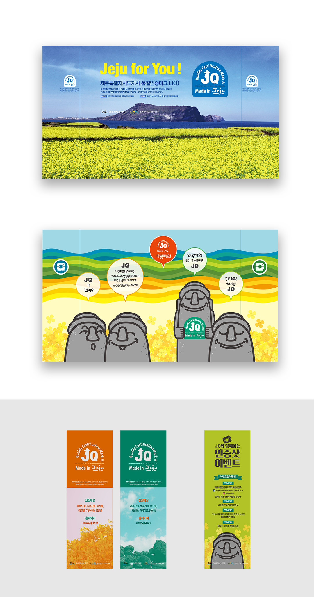 제주우수제품품질인증 JQ마크를 홍보하기 위한 미라지부스 그래픽이다. 포토존은 제주의 상징인 돌하르방이 JQ마크를 홍보함으로 친근하게 다가올수 있도록 하였으며, 배경으로 파랑(제주 바다, 하늘, 바람), 녹색(한라산의 푸르름), 연두(녹차, 들판), 오렌지(제주 감귤, 한라봉), 노랑(유채꽃), 제주의 상징들을 컬러로 부드럽게 표현하였다.