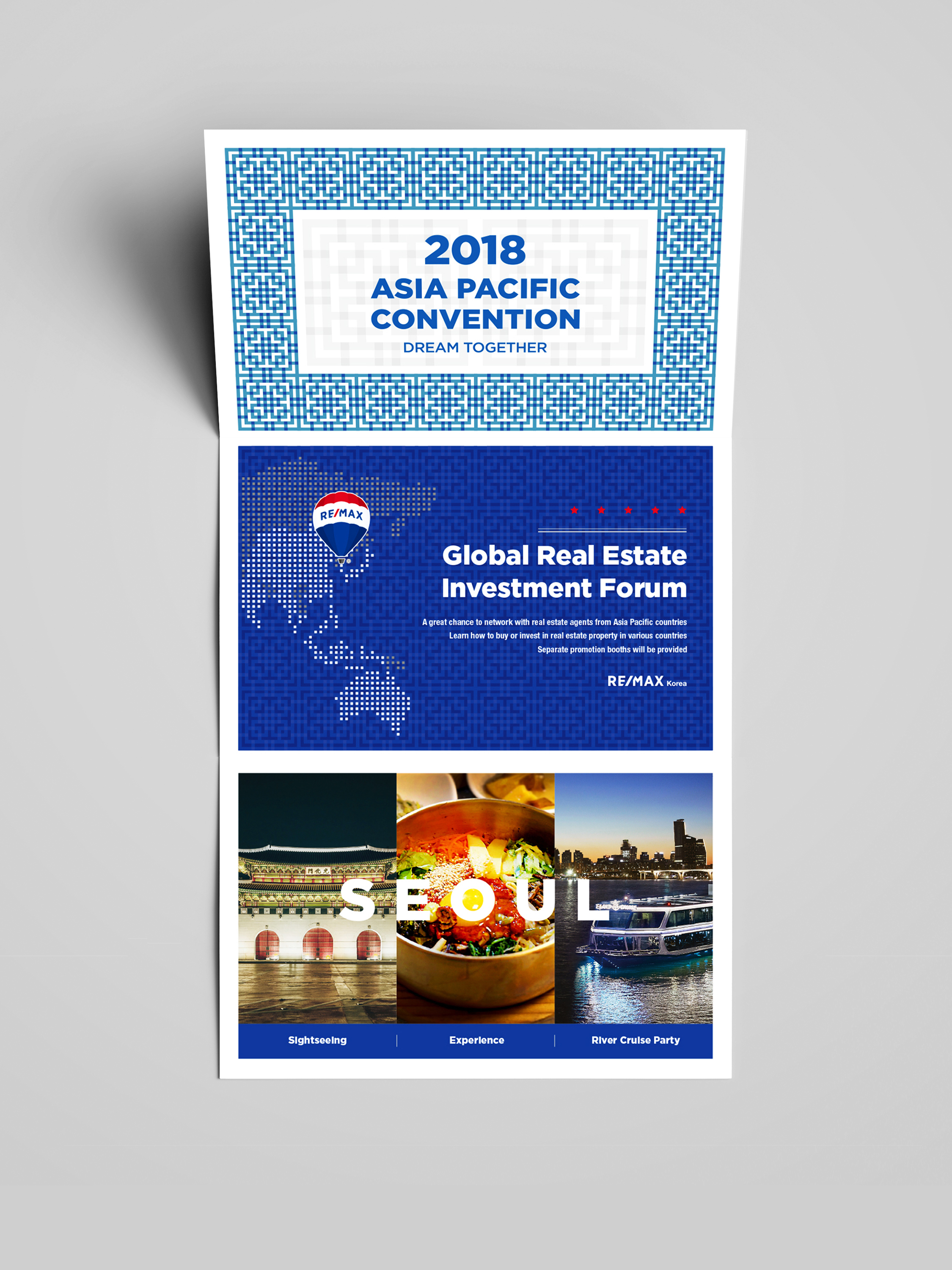 다국적으로 부동산 관련인이 모이는 리맥스아시아퍼시픽컨벤션을 위한 초대장으로 리맥스의 정체성과 함께 한국적인 컨셉을 반영하여 디자인하였다. 한국의 전통문양을 모티프로 하였으며, 또한 IT 강국으로서의 디지털이미지도 느껴지도록 의도하였다.