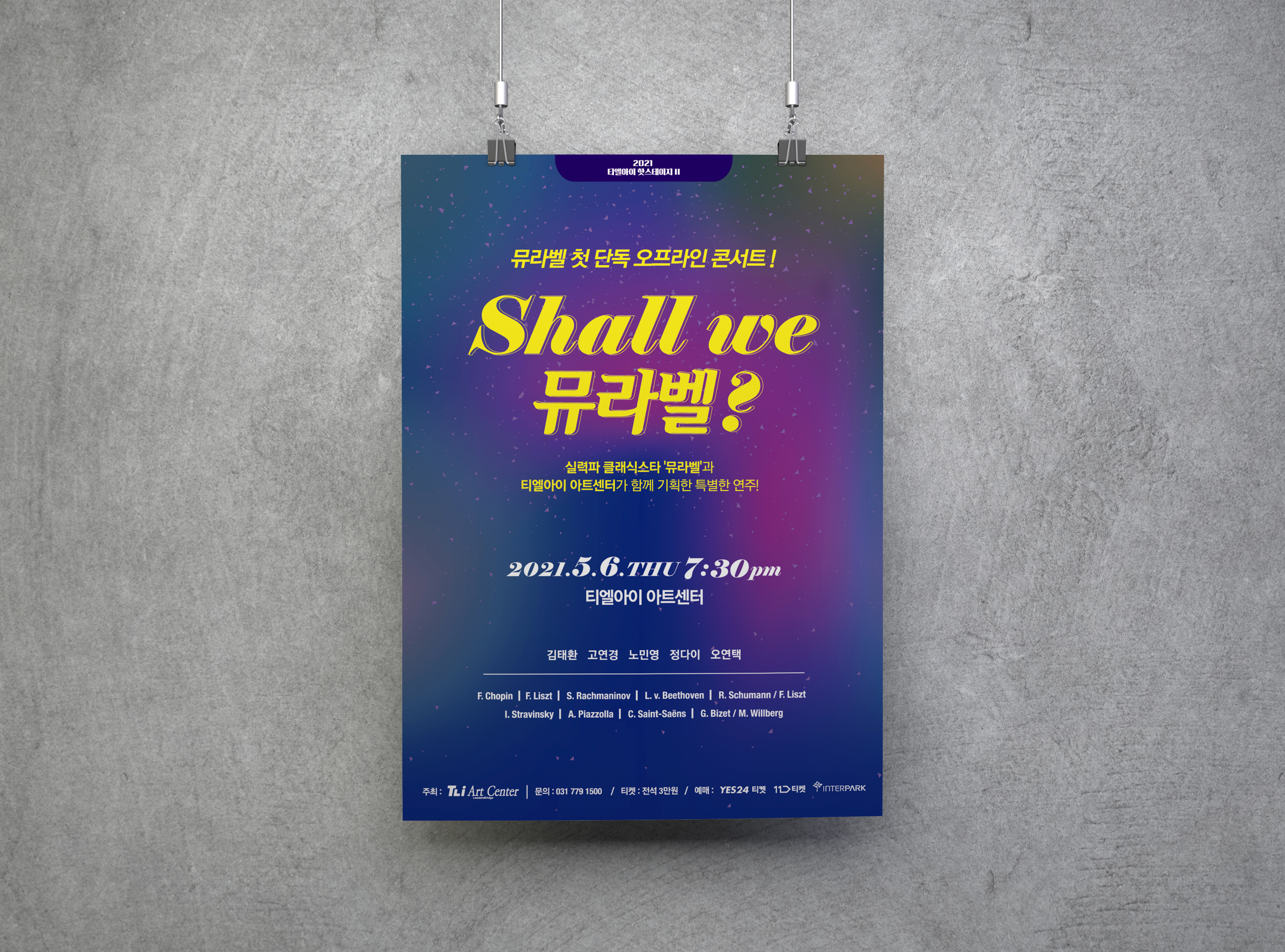 티엘아이 아트센터에서 주최하는 뮤라벨 단독 오프라인 콘서트 포스터 디자인이다. 젊은 실력파 뮤지션들을 반짝이는 별로 대응시키는 컨셉으로 뮤지컬과 같은 분위기를 넣어 작업을 진행하였다.