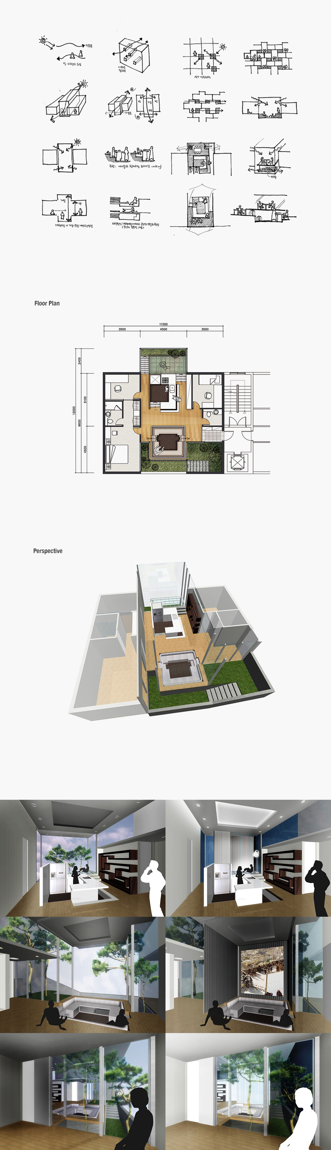 공간에 추임새를 넣자! 사이의 경계는 나눔(분리)가 아닌 관계맺기를 위한 흥겨운 놀이판이다! 함께 즐기면서 공감의 폭을 넓힐 수 있는 교류의 장으로서 돕는 주거공간계획이 필요하다. 옛 선인들이 지은 우리의 주거공간에서 배려했던 자연을 거스르는 법 없이 주거공간에 끌어들이고 가족간의 친밀한 유대감을 형성케하는 공동체개념을 미래의 주거공간아파트에 적용하였다.